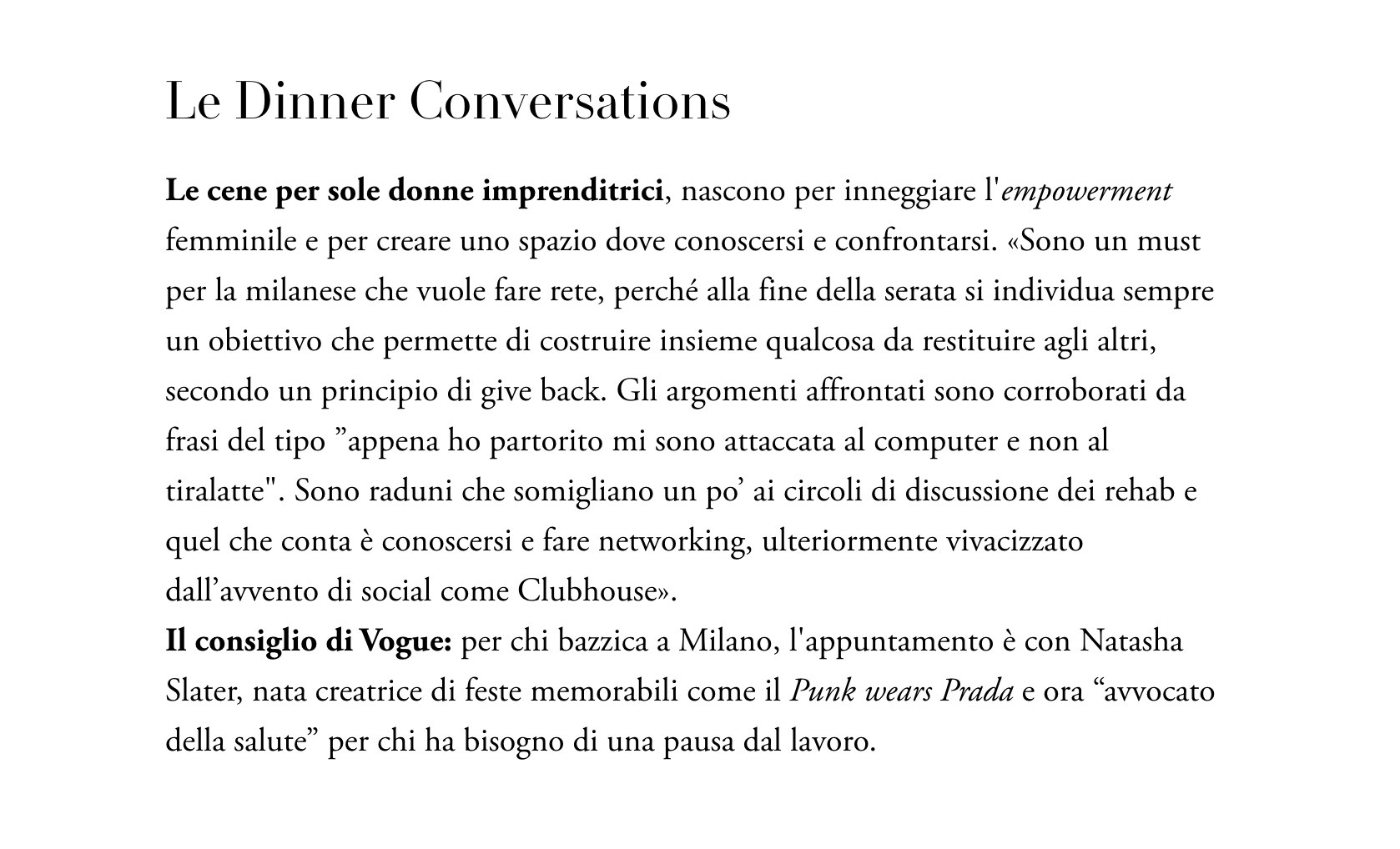 Il consiglio di Vogue: per chi bazzica a Milano, l'appuntamento è con Natasha Slater, nata creatrice di feste memorabili come il Punk wears Prada e ora “avvocato della salute” per chi ha bisogno di una pausa dal lavoro.